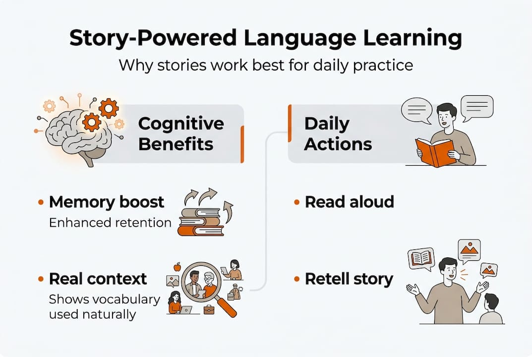 Research shows that diverse story contexts boost higher-proficiency learners, while humor-based stories are especially effective for those still building confidence. Match your story type to your current state, not just your level.