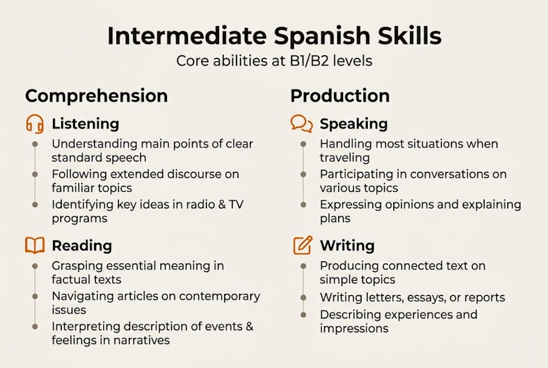 | Intermediate defined | B1/B2 Spanish means you can handle most real conversations and begin expressing detailed ideas. |