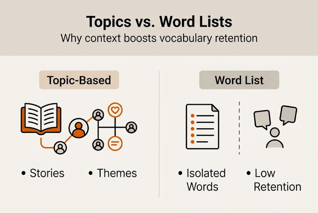 Rote lists are not useless. They can help you recognize high-frequency words quickly. But if your goal is to actually use the language — to speak, respond, and express yourself — topic-driven learning is the more direct path.