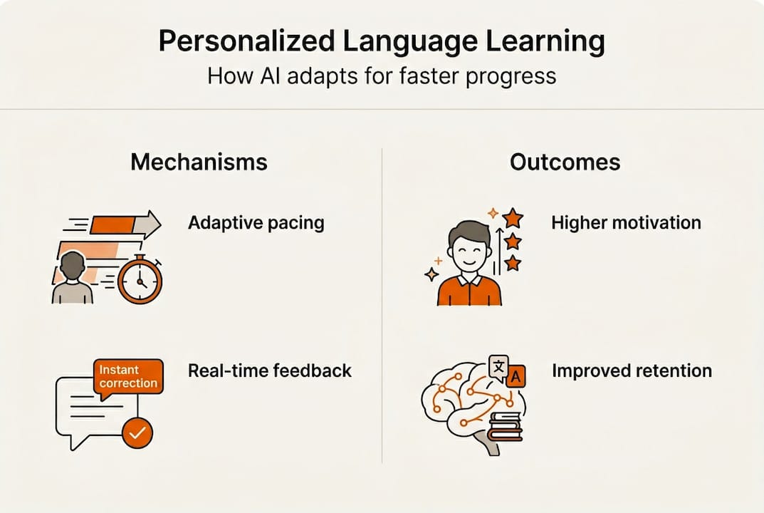 AI analyzes your performance in real time, identifying patterns you might miss. It provides immediate, specific feedback on pronunciation, grammar, and vocabulary usage, allowing instant correction. Research shows this increases exercise completion by 8.5% and accuracy by 8% compared to delayed or generic feedback.